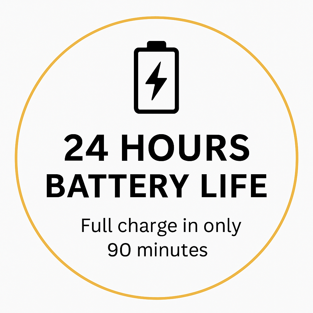 Battery life lasts up to 24 hours on standby. Charging takes approximately 90 minutes via USB-C.